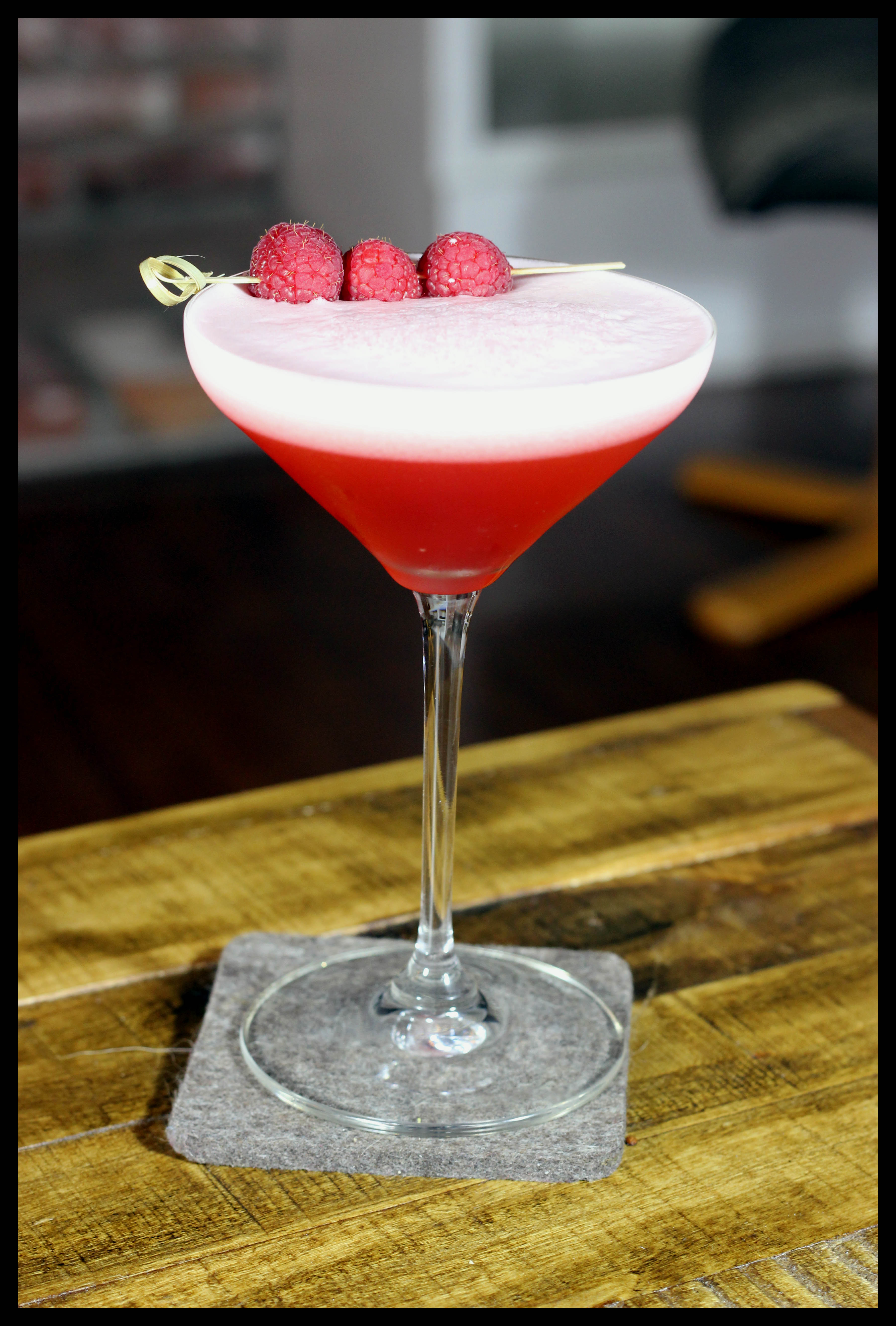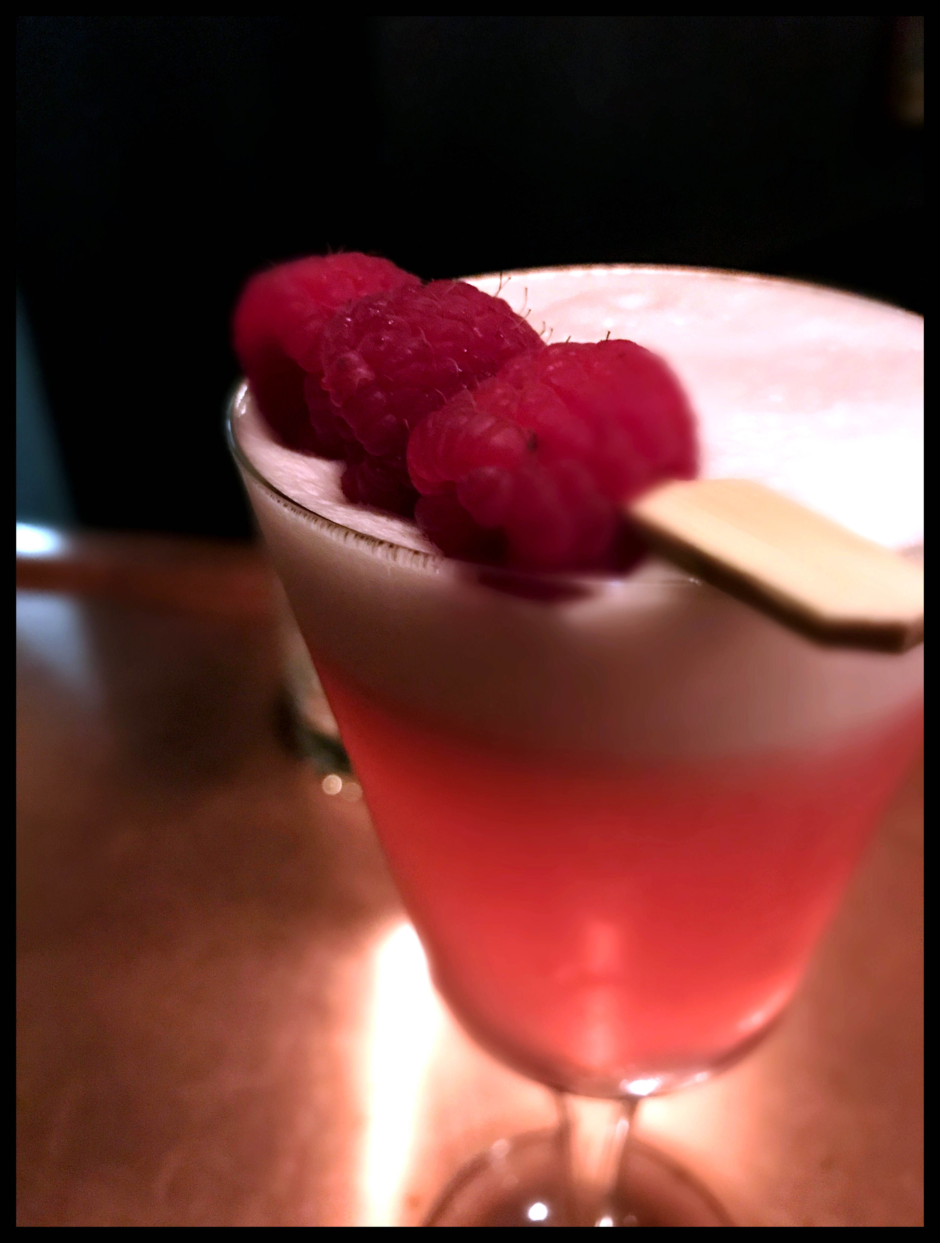 Add egg white to tin. Add the rest of the ingredients, as well as the raspberries. Seal, hold tight, and dry shake, without ice, for 5-6 seconds. Add ice, reseal tins and shake hard for 15 seconds. Strain into cocktail glass. Express a lemon peel over the top, then discard peel (for the aroma). Garnish with a raspberry, or 2, or 3, on a pick.